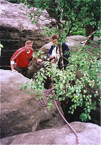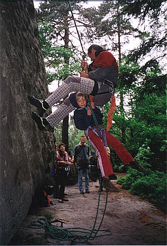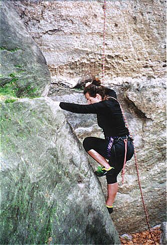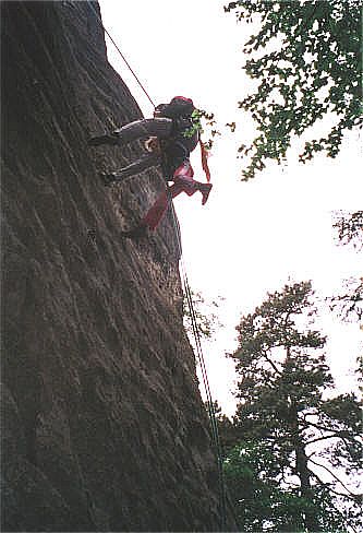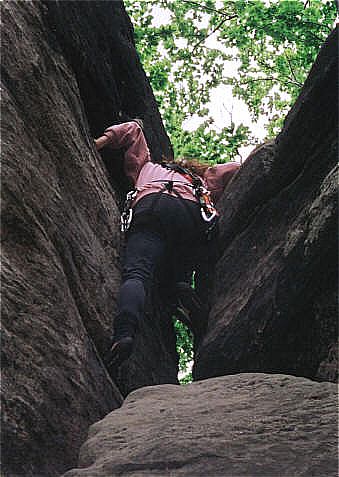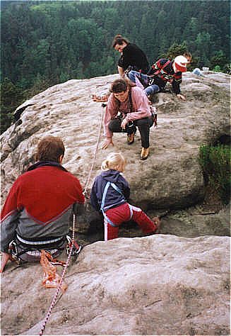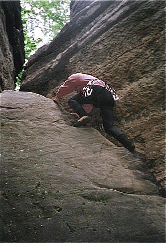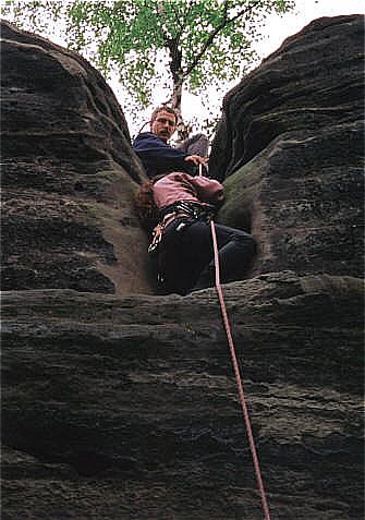 Diesr Gipfel bildet den Abschluß eines Sandsteinriffes. Im hintersten Winkel der Scharte führt der Alte Weg (II) zum Gipfel. Die Schlüsselstelle liegt im Einstieg der oberen Rinne zum Gipfelplateau. Holger Natusch |