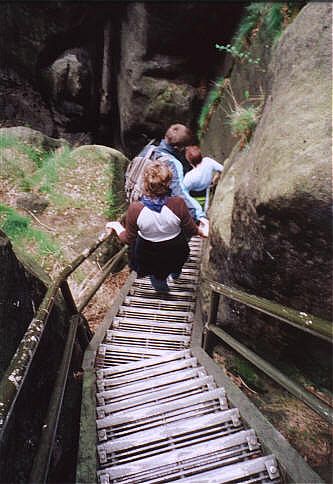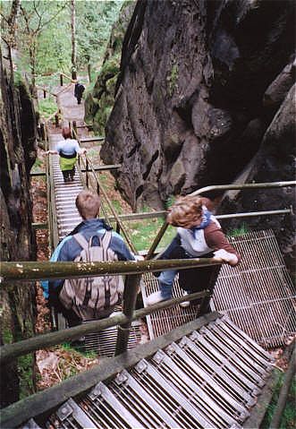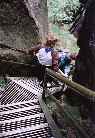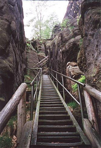 Die Heilige Stiege ist ein sehr stufenreicher Aufgang zum Grat und Plateu zwischen Schrammsteinkette und Winterberg. In Ihrer Nähe befinden sich zahlreiche Klettergipfel mit allen Schwierigkeitsgraden. Einer der Imposantesten ist die Flohspitze. Der Alte Weg mit ausgiebiger Unterstützung (VIIa) und ohne Unterstützung (VIIc). Holger Natusch |