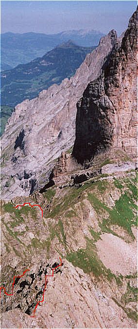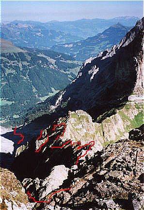 Um zur Dossenhütte zu gelangen, empfiehlt es sich mit dem Postbus von Meiringen aus bis zur Rosenlaui zu fahren. Noch besser ist es, eine Station weiter bis zum Gletschereingang. Von da aus nimmt man die Gletscherschluchtbesichtigung mit, oder begibt sich rechts davon direkt zum Aufstiegssweg. Im unteren Teil ist es ein normaler, etwas anstrengender Wanderweg. Hat man die Schotterhalden hinter sich gelassen, wird der Weg schwieriger. Er nimmt langsam Klettersteigcharakter an. Fixseile und Leitern erleichtern den Aufstieg. Jedoch sind diese nur an äußerst steilen Passagen zu finden. Für den Rest des Weges ist Höhentauglichkeit und Trittsicherheit gefragt. Die von der Gletscherschlucht bis zur Hütte zu überwindende Höhe beträgt ca. 1300 m !!! Dies sollte man bei der Zusammenstellung des Gepäcks beachten. Die erste Schlüsselstelle befindet sich nach der Gletscherschlucht. Hier geht man zunächst gerade bis amn an eine Brücke kommt, die links über die Schlucht führt. Immer weiter aufwärts, dabei am Abfang links haltend. Hat man die erste steilere Stelle überwunden geht man geradewegs in das sich angrenzende Tal hinauf. Rechts ab führt ein Pfad auf den Gletscher. Wir halten uns links und immer aufwärts. Nachdem der grobe Schotter überwunden ist führt der Pfad auf feineren Schotter steil links im Zickzack an. Auf dem Grat der Schotterhalde geht es weiter hinauf. An deren Ende beginnt die erste Steilstufe, die durch Fixseile und eine Leiter gesichert ist. Beim Benutzen der Leiter ist etwas Vorsicht geboten. Sie ist oben nur über einen Stahlstift eingehangen. Man kann sie also ganz leicht ungesichert in der Hand halten. Hat man diese Steilstufe überwunden geht der Pfad links weiter unterhalb der Winterbiwakschachtel. An dieser links vorbei und die Steilschrofen der Markierung folgend immer bergauf. Auf dem Riff angelangt rechts queren (Fixseil). Sobald man die Felsecke umquert hat sieht man auch schon die Dossenhütte oben warten. Es ist jedoch noch ein jäher Anstieg. Ca. 250 Höhenmeter und alles über steile Schrofen. Nimmt man den bis dahin zurückgelegten Weg und die Anstrengungen, will beim Anblick der Hütte von dieser Position aus nicht so richtig Freude aufkommen. Spätestens hier flucht man über zuviel Eingepacktes. Ist dann der letzte Anstieg gemeistert, die Hütte erreicht und das Atemholen wieder auf Normalmaß, dann stellt sich alsbald die Freude über das traumhafte Panorama ein, welches sich von fast jedem Standpunkt der Dossenhütte bietet.