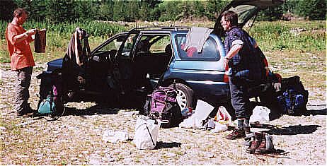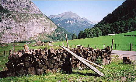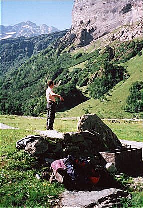 Ab und zu sollte man die Beschreibungen in den Führern eben genau lesen. Über 2200 m Abstieg und wohl ca. 27 km Wegstrecke. Der Abstieg hatte es aber in sich. Die Rucksäcke drückten. Auch hier wieder an ausgesetzten Stellen Fixseile. Mittendrin fehlte kurz die Markierung. Aber wir waren bald wieder auf den richtigen Weg, wenn er auch erst einmal entgegengesetzt verlief, Richtung Gaulihütte. Im hintersten Winkel konnten wir den Bach endlich überqueren und befanden uns somit auf der gegenüberliegenden Seite im Urbachtal. Ein Schild am Weg verriet uns, warum wir nicht am Bach entlang gehen sollten. Der Bach wird von Zeit zu Zeit geflutet; zwecks Energiegewinnung. Und so stiegen wir auf dieser Seite des Tales weiter bergab. Ich hatte schon Schmerzen im Knie bevor wir von Dresden losfuhren, aber jetzt kam noch hinzu, daß ich es kaum wagte aufzutreten. Das hatte nichts mehr mit Trittsicherheit zu tun. Als wir endlich im Talausgang waren, war eine längere Rast nötig. Wir waren sichtlich erleichtert als uns Maik, der zur Rosenlaui abgestiegen war mit dem Auto entgegenkam.